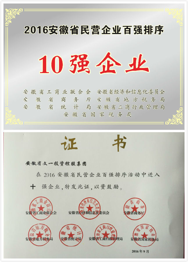 9月27日,在2016安徽省民营企业百强排序发布会上文一集团被授予“安徽省民营企业10强”荣誉称号,这是集团连续六年获此殊荣。在百强排序中,文一集团排名2015年度安徽省民营企业纳税百强第三位,营收百强第四位,同时,本次会议还公布了安徽省入围2016中国民营企业500强、中国民营企业服务业100强企业名单,文一集团分别排名第356位和91位。