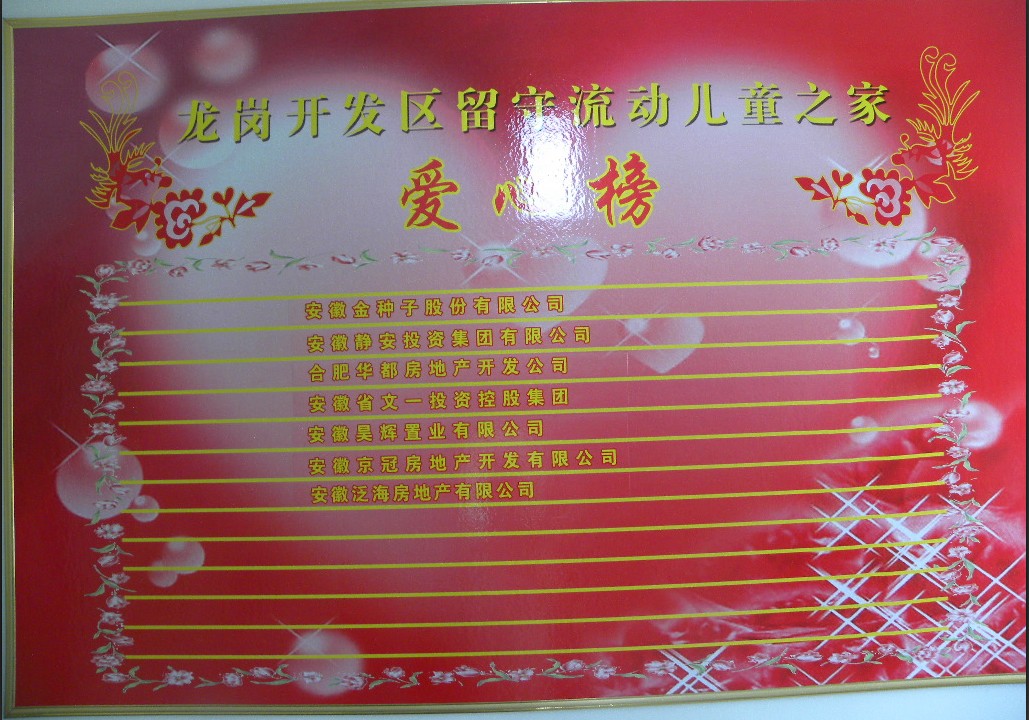5月30日上午,合肥市最大留守流动儿童之家在瑶海区龙岗开发区揭牌。文一集团作为爱心捐助企业之一,受邀走进留守流动儿童之家,了解孩子们在这里的学习、生活状况。那里设有健身室、巧手坊、电子阅览室、心灵驿站、作业辅导室、童心剧场7个功能室和一个室外儿童活动场所等,将为生活在龙岗开发区的800多名留守儿童和2600多名流动儿童提供了课外时间学习、娱乐的场所。文一企业除资助15万元参与建设儿童之家,还为其设立了儿童图书馆, 企业用这样的实际行动希望唤起更多的爱心人士关注关心留守流动儿童健康成长,积极开展关爱助学和困难帮扶活动,勇于承担社会责任,奉献自己的一份爱心,共同为少年儿童创造更加良好的学习、生活环境,为他们撑起一片蓝天。