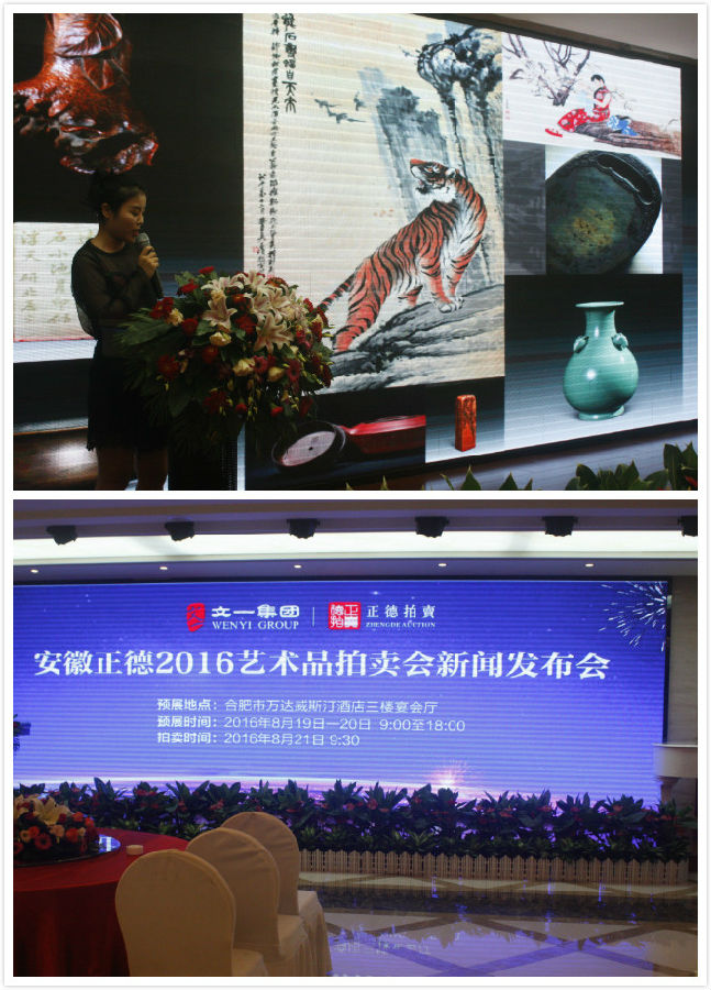 8月17日,安徽正德2016首场艺术品拍卖会新闻发布会在一品宴铜陵路店隆重举行,文一集团副总裁陈忠、安徽正德拍卖有限公司负责人以及行业专家、合作伙伴、新闻媒体等100余人出席了此次发布会。