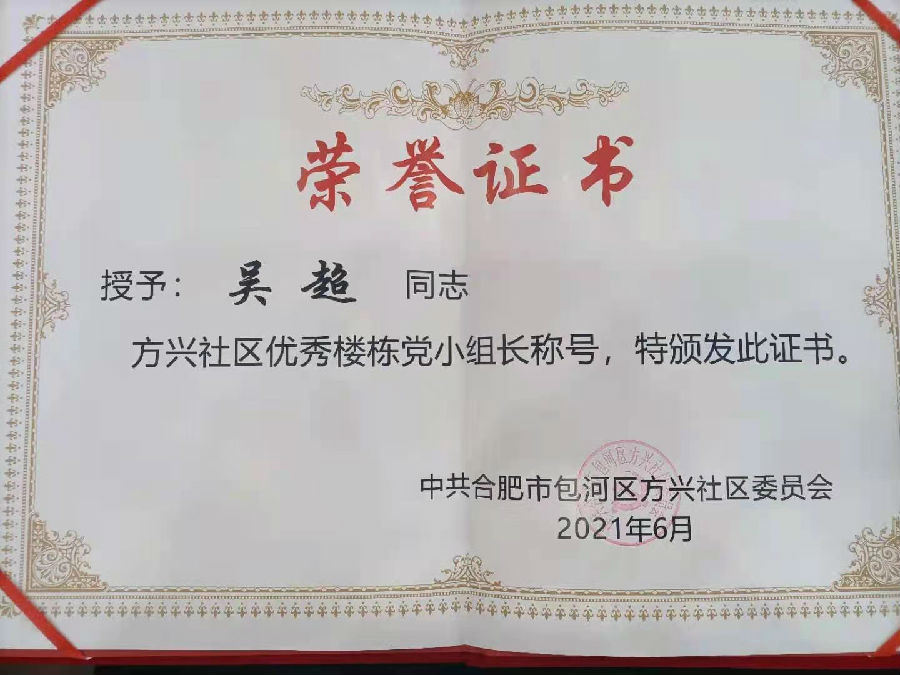 (吴超被授予“优秀楼栋党小组长”荣誉称号)