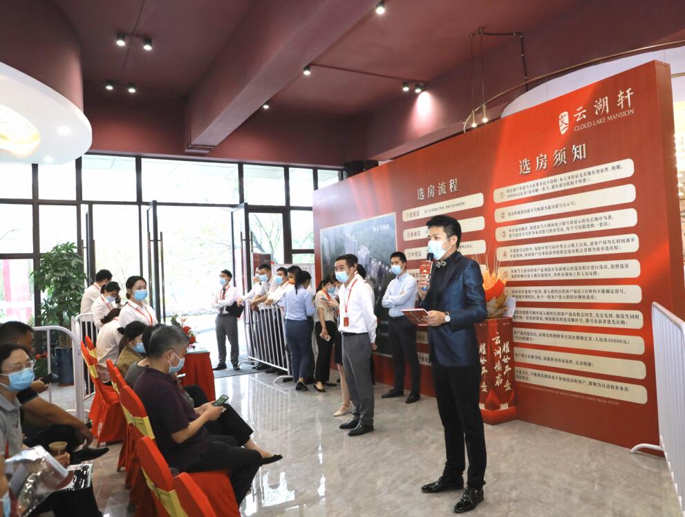 随着主持人话音落下,文一·云湖轩选房正式开始,现场通过摇号的方式,每轮5组客户进行选房,对湖山的热爱,让客户们早已在内心敲定理想房源,因此选房时果断出击,销控板上64套房源分秒递减,现场热烈的气氛达到制高点。