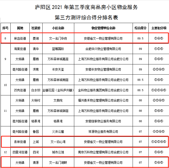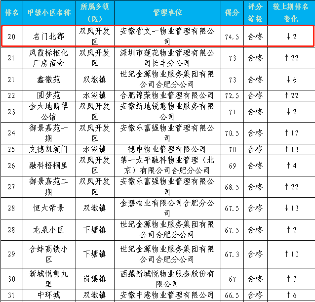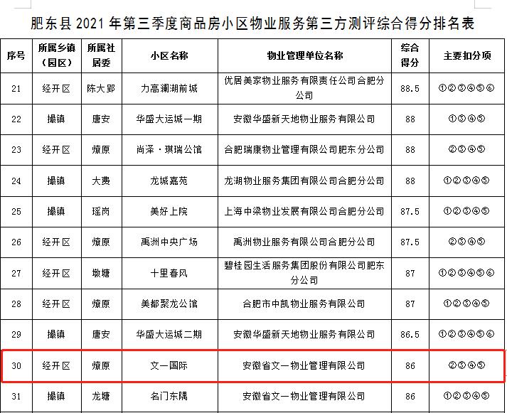 肥东县100个住宅小区纳入物业管理服务巡查测评,文一·国际位居前三十名。
