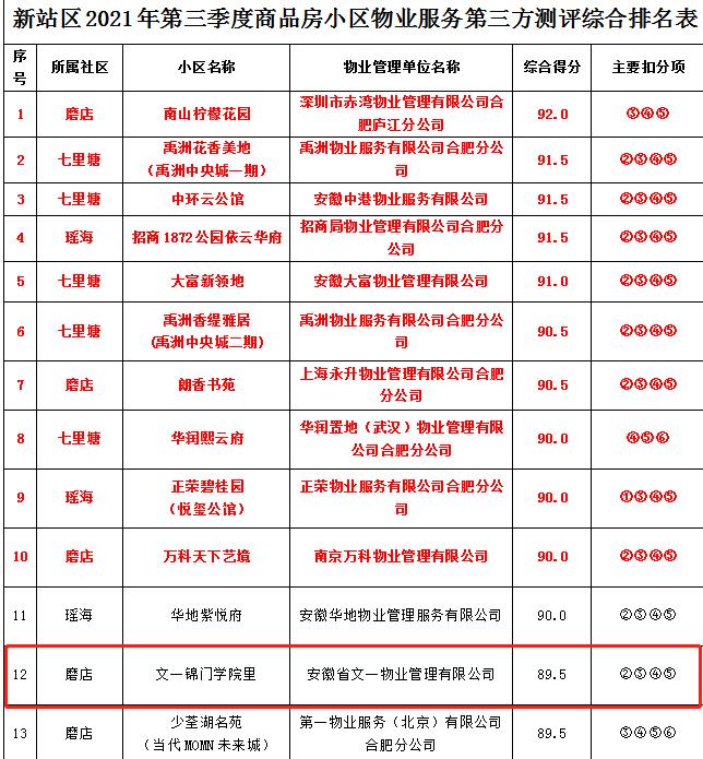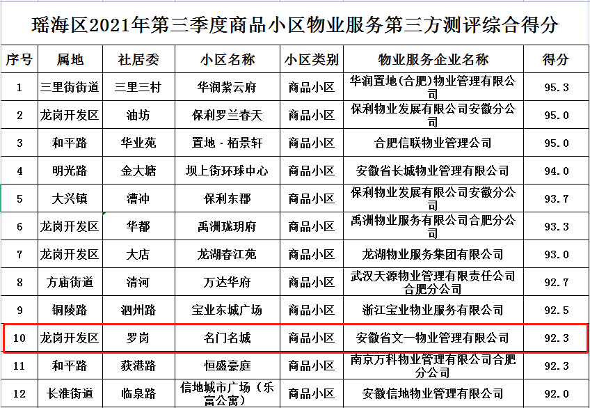 瑶海区对辖区内217个商品房小区纳入物业管理服务巡查测评,文一·名门名城位居前十名。