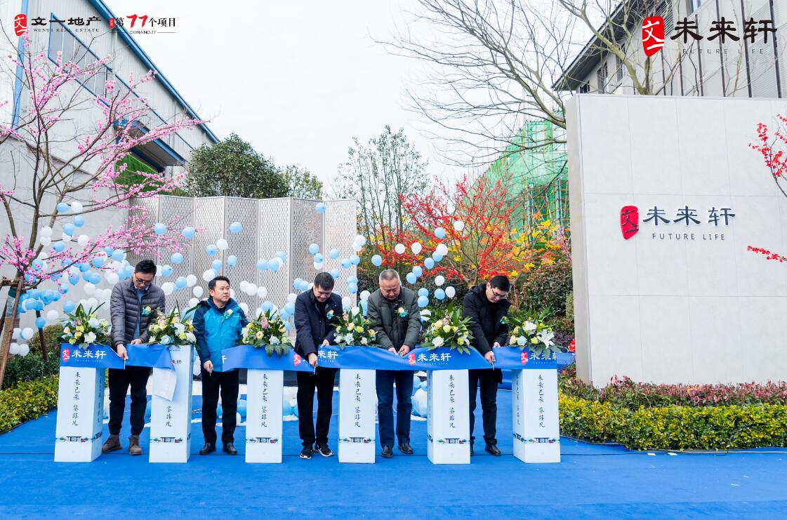 致辞演讲结束后,在众人见证下,剪彩仪式正式开始。文一房地产集团执行总裁/合肥东区城市公司董事长陈嘉祥,房地产集团总裁助理朱峰松,房地产集团合肥东区城市公司副总裁/肥东置业公司总经理叶士贤,房地产集团销售管理二部副总经理吴洪顺,安徽世联行营业二部总经理盛诗培在全场的气球放飞中,共同剪断缎带。文一·未来轩未来生活美学馆暨景观示范区自此华美绽放,精致的生活品质如画卷般逐步展现。