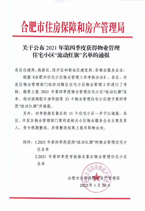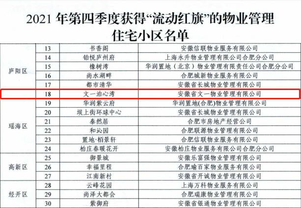 据合肥市住房保障和房产管理局最新颁布文件,文一物业泊心湾以优异的物业管理水平入选2021年第四季度“流动红旗”的物业管理住宅小区名单,获得 “流动红旗”荣誉称号。