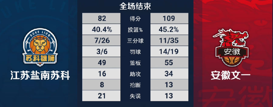 没有任何意外,安徽文一在第四节继续保持着攻防两端的关注度,没有给江苏盐南苏科任何希望和机会。最终,全场比分定格在109-82,安徽文一以总比分2-0淘汰对手,挺进半决赛。