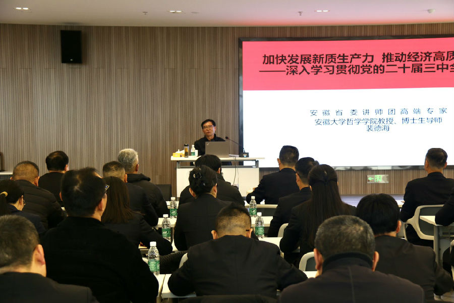 12月17日,为深入学习贯彻党的二十届三中全会精神,文一集团党委特邀安徽省委讲师团高端专家,安徽大学哲学院教授、博士生导师裴德海,以“加快发展新质生产力、推动经济高质量发展”为主题,为集团全体党员、预备党员、入党积极分子讲授专题党课,使集团全体党员不断提升理论素养,保持党员先进性,在推动企业发展中充分发挥先锋模范作用。