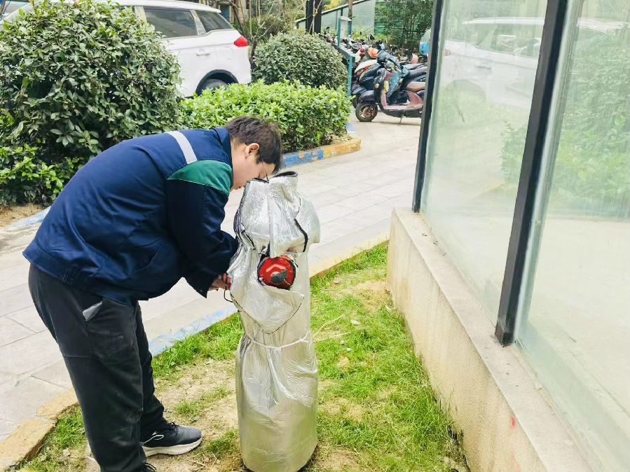 肥东服务各项目开展设施设备冬季防冻保温工作。工程师傅们给室外消防设施“穿衣戴帽”,用保温棉对室外消防栓、供水管、架空层下水管等设施进行包裹,确保各项设施设备在寒冬里正常运作。