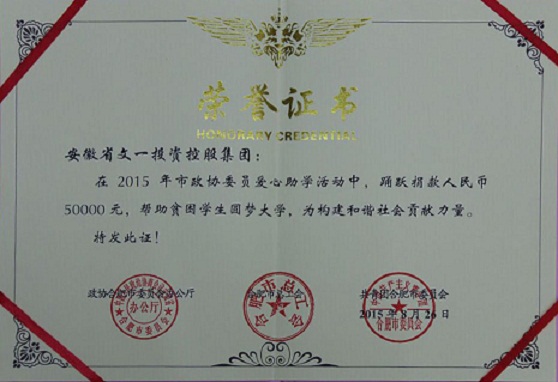 8月26日,在合肥市政协委员爱心助学捐赠仪式“爱心汇聚放飞梦想”活动上,文一集团踊跃捐助人民币五万元,帮助贫困学生圆梦大学,荣获由合肥市政协办公厅、市总工会、团市委联合颁发的荣誉证书,集团党委书记韦存华受邀出席捐赠仪式并领奖。