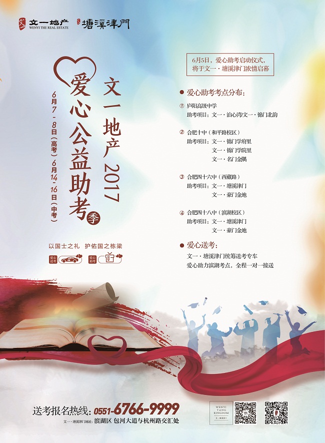 “文一地产助梦季暨2017江淮晨报公益爱心助考”活动即日起正式启动5个爱心助考点服务考生,文一·塘溪津门将提供爱心送考专车