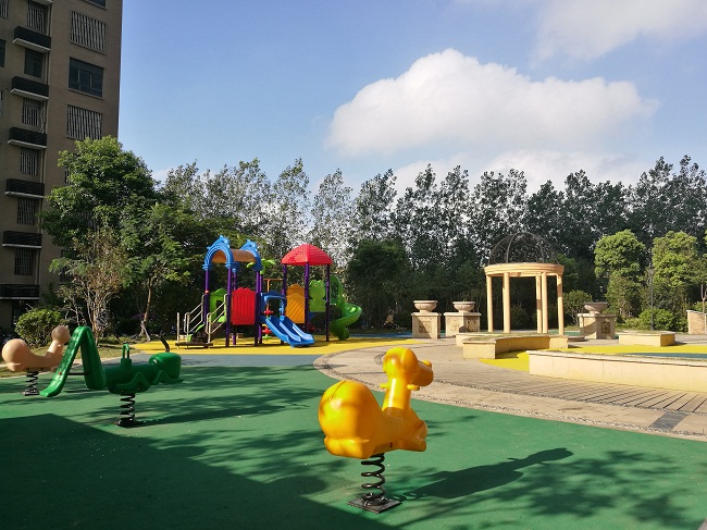 9月20日早上8点多,户外阳光明媚,空气清新。星河港湾刚刚改造完成的广场上聚了许多居民,儿童游乐设施吸引了孩子们嬉戏玩乐。广场地上是新铺设的黄绿蓝相间的塑胶跑道,既能美化地面,又可以防止孩子摔伤,备受居民喜爱。