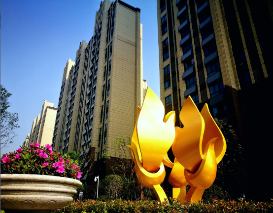 (小区入口处的金色花形雕塑,寓意花开富贵、金玉满堂)