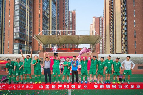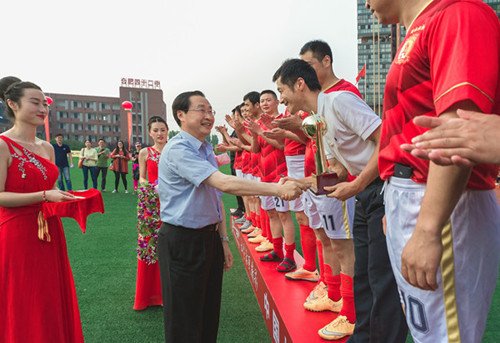 5月24日下午,“文一杯”合肥市首届青年足球赛总决赛在42中中铁国际城分校举行。团省委副书记杨正,市政府副秘书长高晓光,庐阳区委书记吴劲,安徽省文一投资控股集团副董事长兼安徽省文一房地产集团总裁韦勇,安徽省文一投资控股集团庐阳置业公司总经理韦继松等领导出席闭幕式并为获奖球队及个人颁奖。