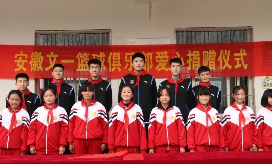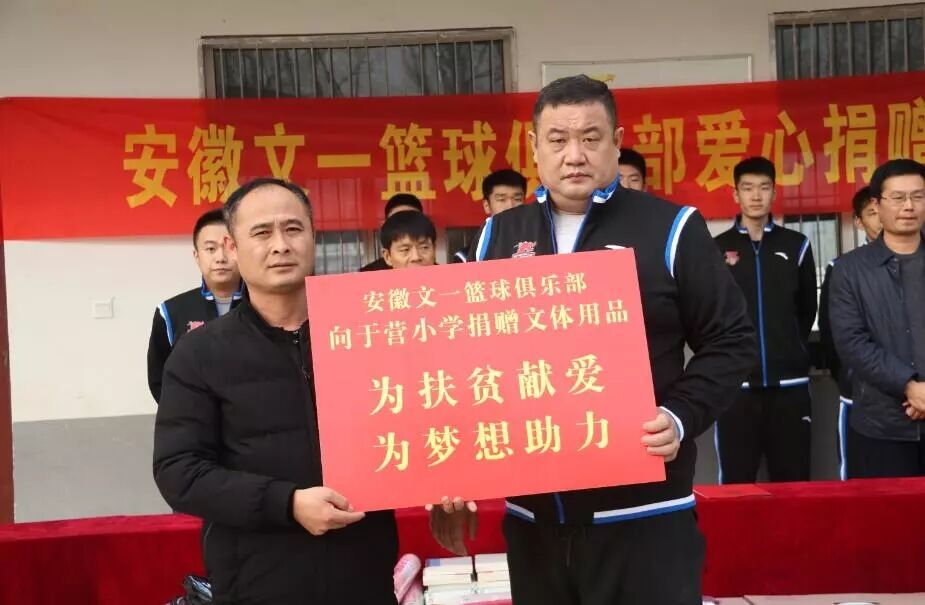 为扶贫献爱,为梦想助力。11月21日下午,安徽文一篮球俱乐部来到阜阳市颍东区插花镇前于村于营小学,开展爱心捐赠活动。捐赠仪式上,安徽文一篮球俱乐部副总经理兼领队徐长锁代表俱乐部向于营小学捐赠了一批文体用品。