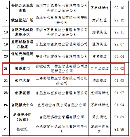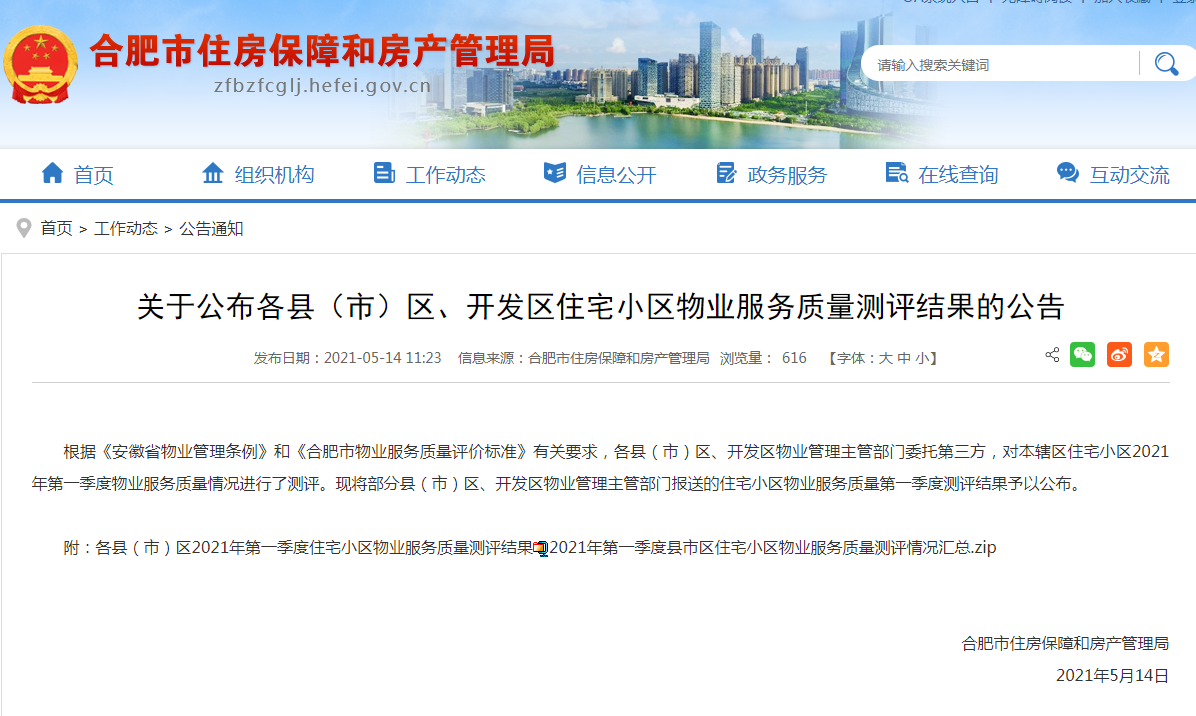 近日,合肥市住房保障和房产管理局发布《关于公布各县(市)区、开发区住宅小区物业服务质量测评结果的公告》。