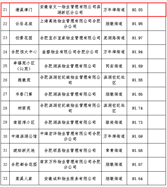 4月24日,2021年包河区第一季度住宅小区物业服务测评结果公布,文一·塘溪津门物业跻身测评榜单第21名,物业管理服务获得上级主管部门认可。